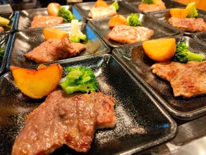 • サーロインステーキ:目の前で焼き上げられる柔らかいサーロインステーキ。お好みでシャリアピンソースや薫るトリュフソースを付けて食べられます。